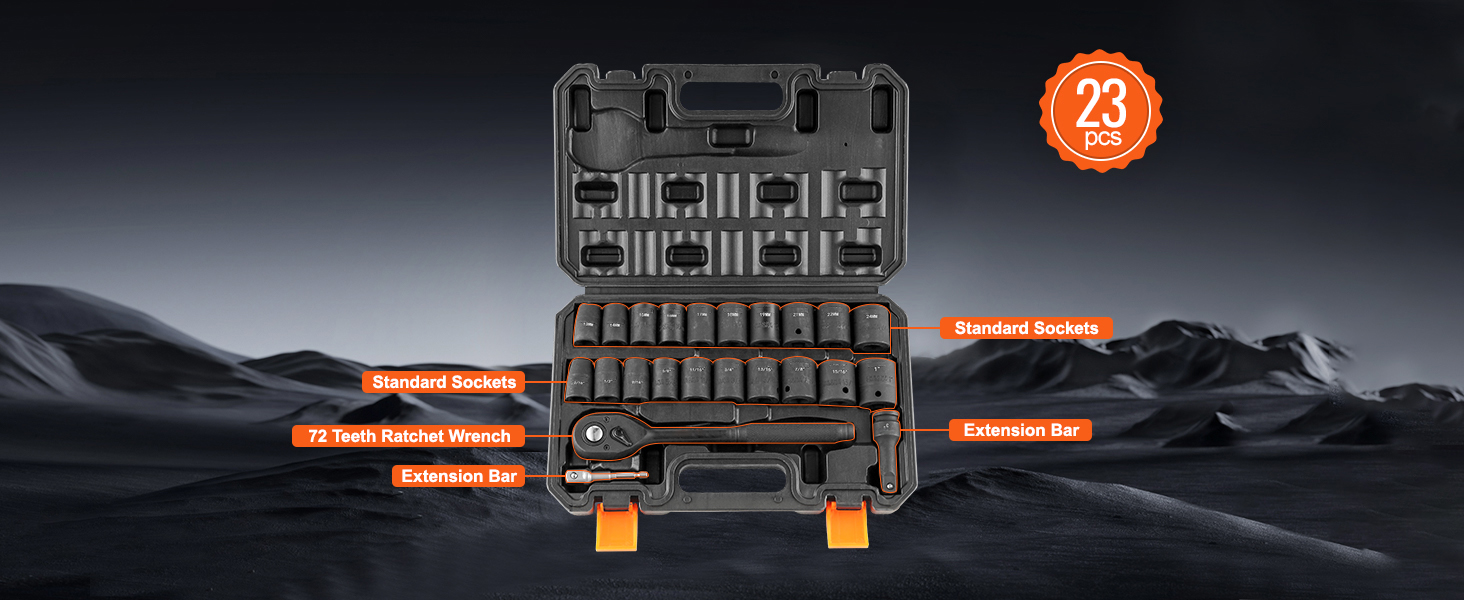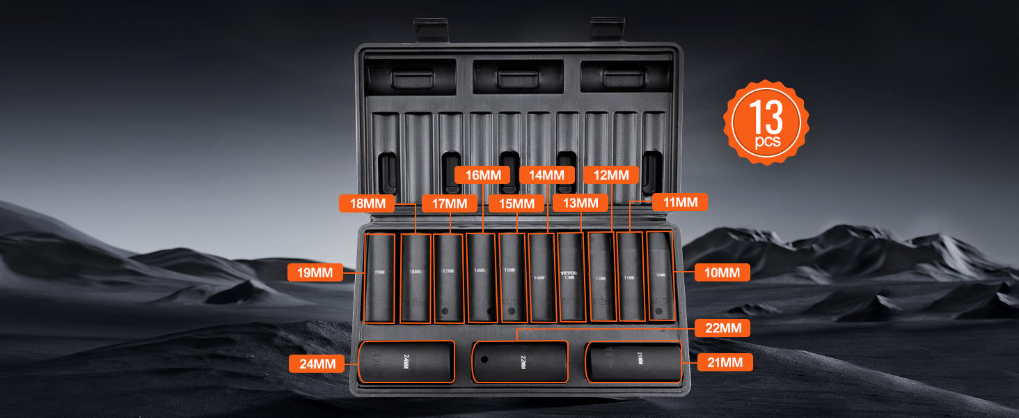 SucceBuy13/ 23/ 33/ 34/ 48/ 65/ 90-piece Impact Socket SetAre you looking for a professional and portable set of impact sockets? SucceBuy's 13-piece impact socket set offers a complete range of tools, especially suitable for repairing different brands of automobiles.With a pro configuration of Cr-Mo 90 pieces, this set can be used with electric wrench, impact wrench, ratchet wrench, rod bender, and other tools for automotive maintenance, equipment assembly, industrial manufacturing, power inspections, and more.With a pro configuration of Cr-V 13 pieces, this set can be used with electric wrench, impact wrench, ratchet wrench, rod bender, and other tools for automotive maintenance, equipment assembly, industrial manufacturing, power inspections, and more.With a pro configuration of Cr-V 23 pieces SAE & Metric, this set can be used with electric wrench, impact wrench, ratchet wrench, rod bender, and other tools for automotive maintenance, equipment assembly, industrial manufacturing, power inspections, and more.With a pro configuration of Cr-V 33 pieces SAE & Metric, this set can be used with electric wrench, impact wrench, ratchet wrench, rod bender, and other tools for automotive maintenance, equipment assembly, industrial manufacturing, power inspections, and more.With a pro configuration of